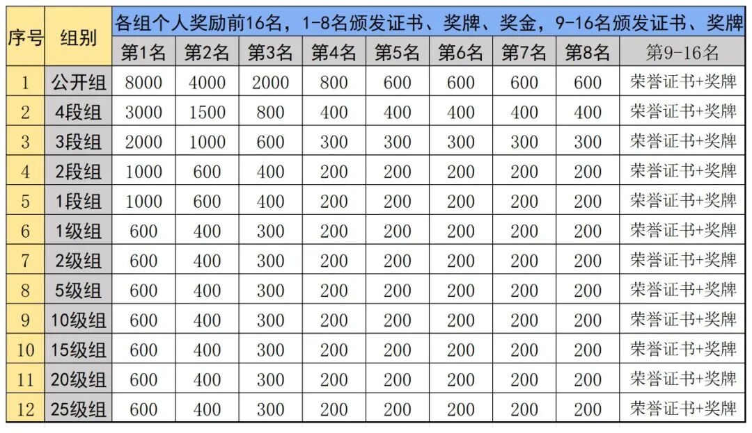 (一)各组个人奖励前16名,1-8名颁发证书、奖金,9-16名颁发证书。(以下奖金均为税前奖金)