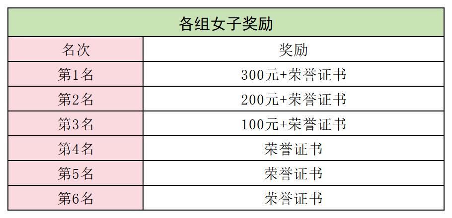 (二)各组女子奖励方案:各组奖励女子前六名,前三名颁发奖金、荣誉证书,4-6名颁发荣誉证书。